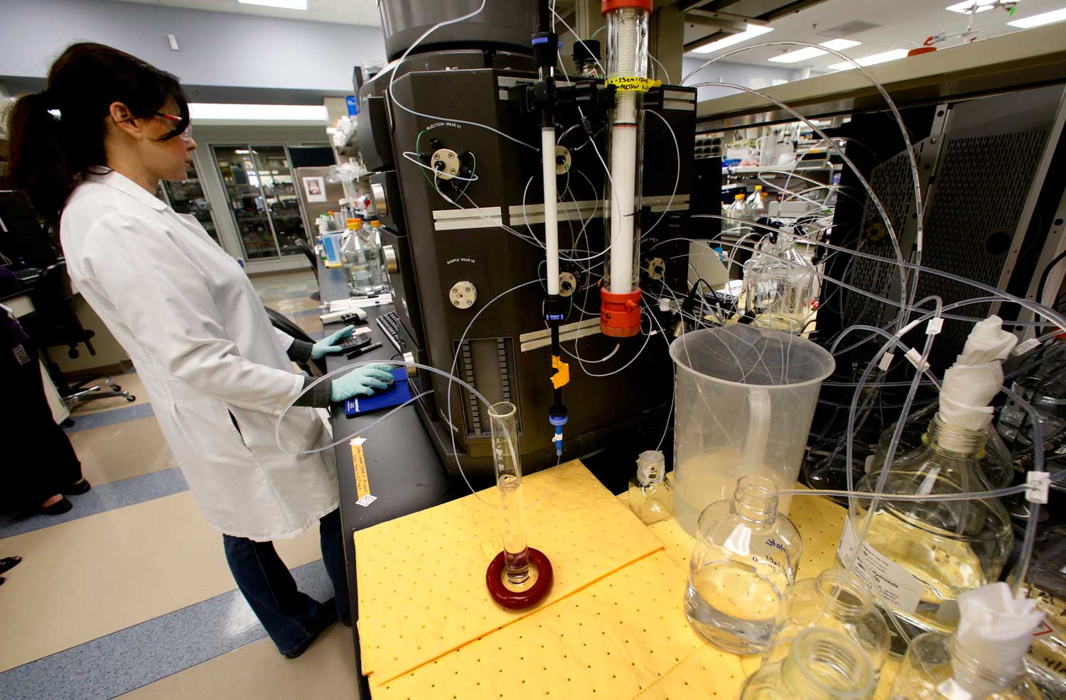 Daudznacionālā biofarmācijas uzņēmuma “Amgen” laboratorijā pētniece strādā ar hromatogrāfijas kolonnu, kas attīra proteīnus. Tauzendouksa, Kalifornijas pavalsts, ASV. 25.04.2013.