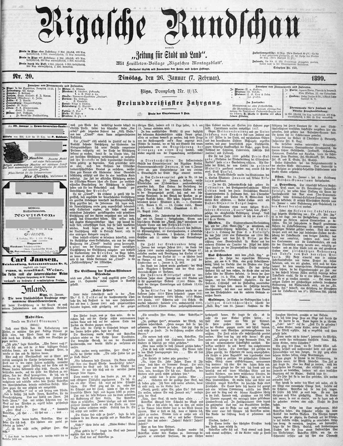 Laikraksta "Rigasche Rundschau" numurs (26.01.1899. Nr. 20), kurā publicēta novele "Andriksons".