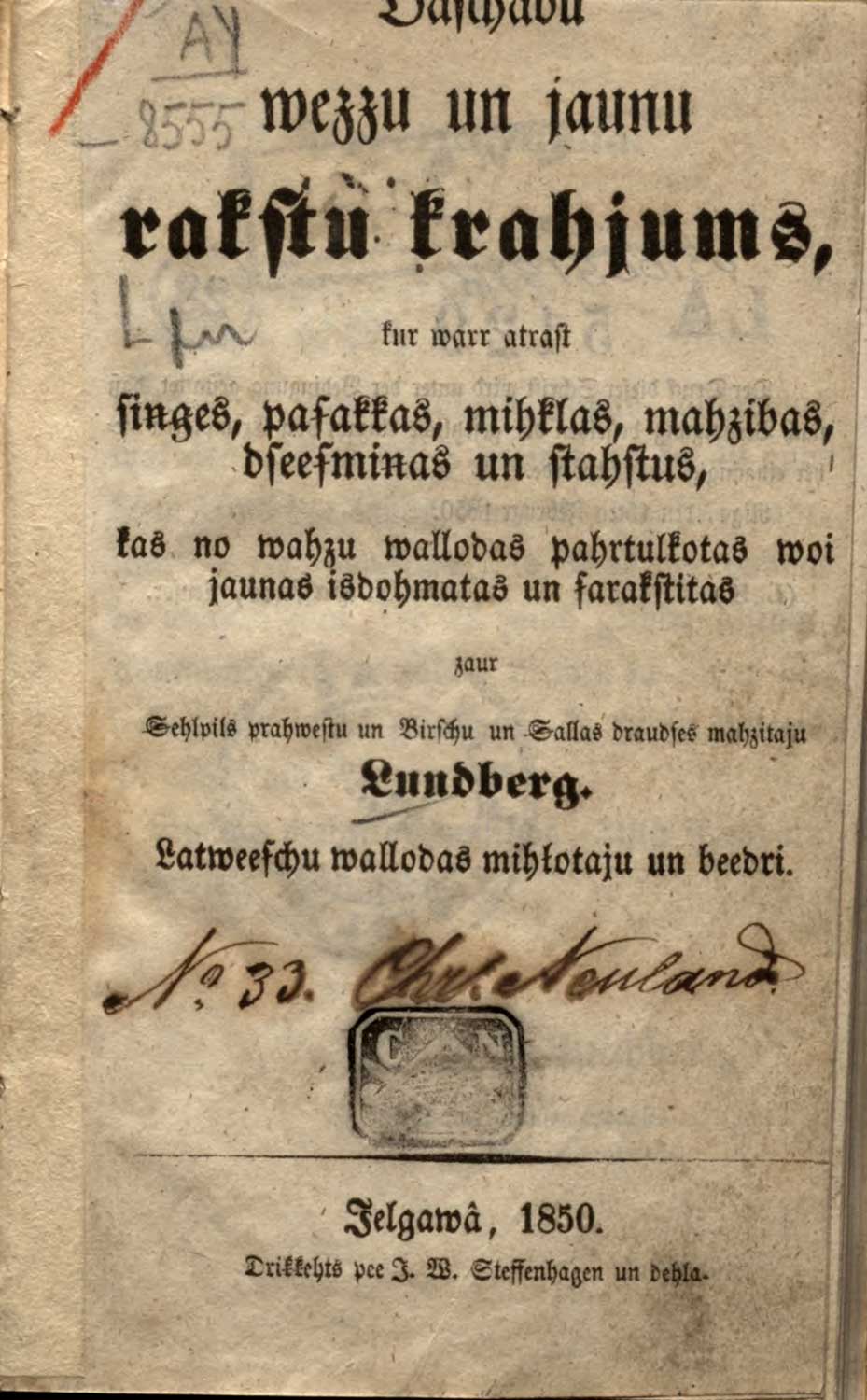 Jākobs Florentīns Lundbergs. "Dažādu vecu un jaunu rakstu krājums". Jelgava, 1850. gads.